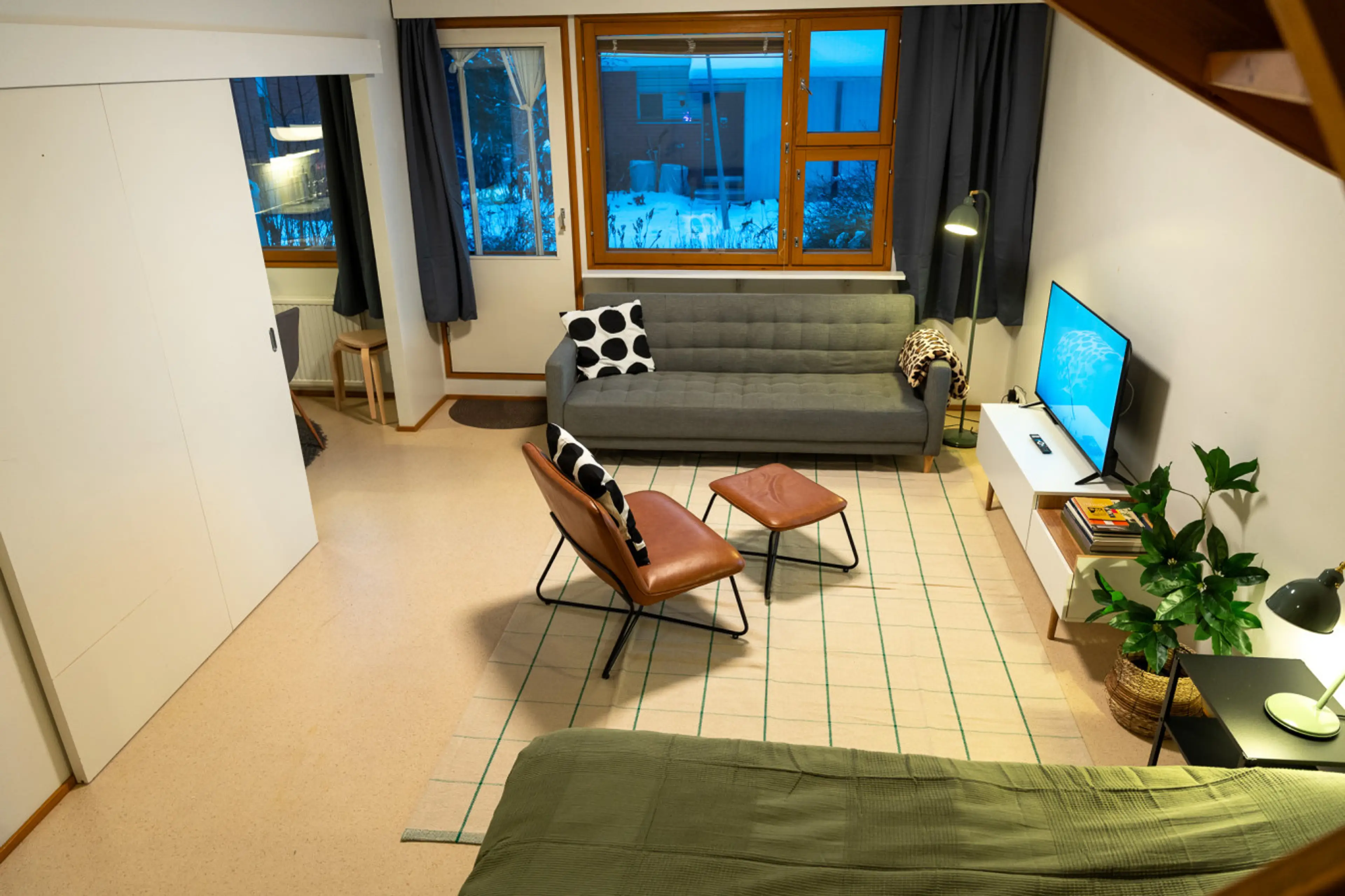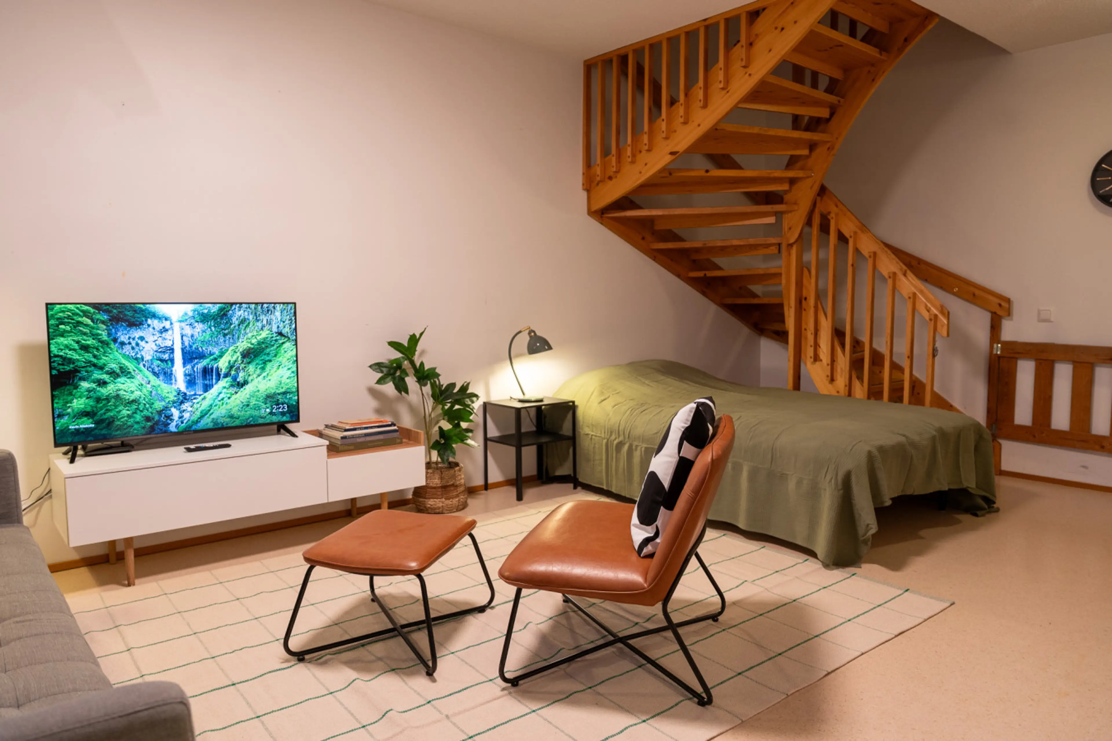 This two-story apartment has its yard—everything you need for a cosy stay. The apartment's top floor has private access, two bedrooms and a bathroom with a washer. The downstairs area features a living space with one double bed and a sofa bed, accommodating a total of 4 persons, as well as a fully ...