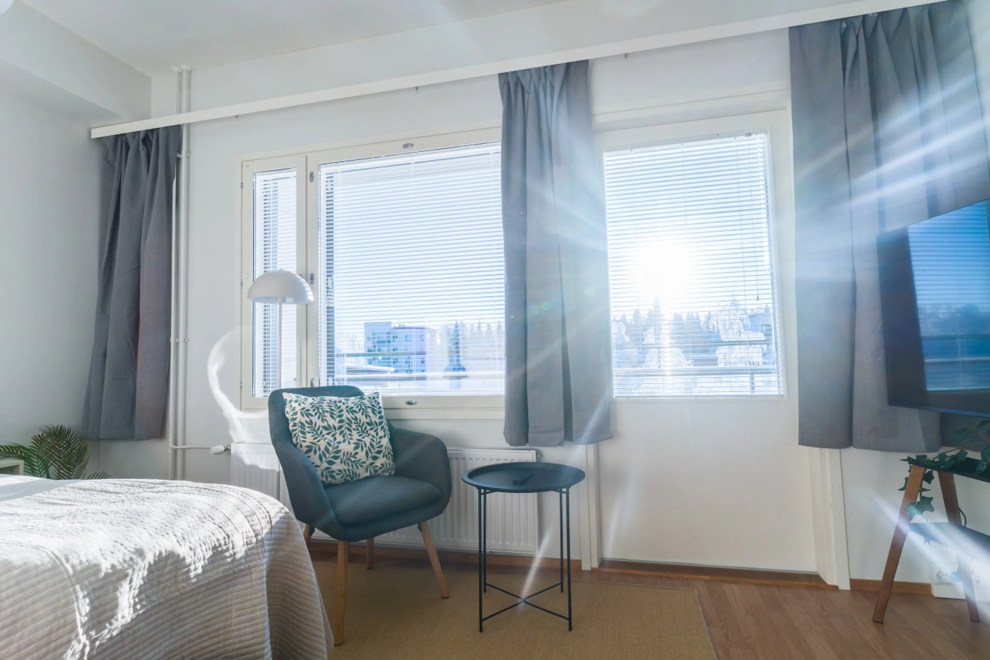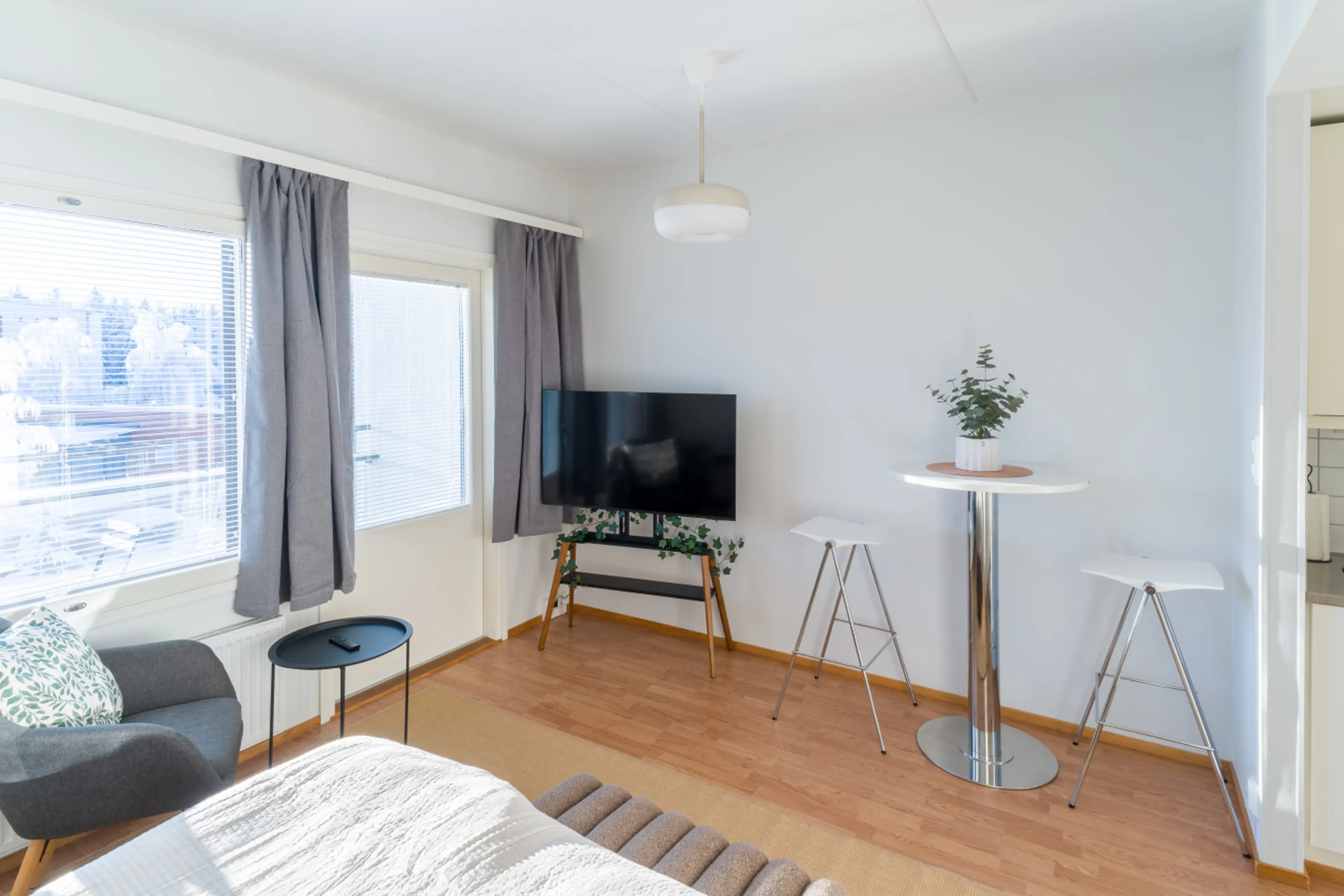 Lovely apartment - close to the nature with sauna. The studio apartment has a kitchen and a living area in one space. The bed is comfortable and 160 cm wide. The living area also has a lounge chair, TV and a small dining table. The kitchen is compact, but has all of the necessary equipment for sho...
